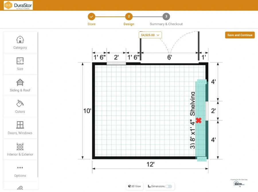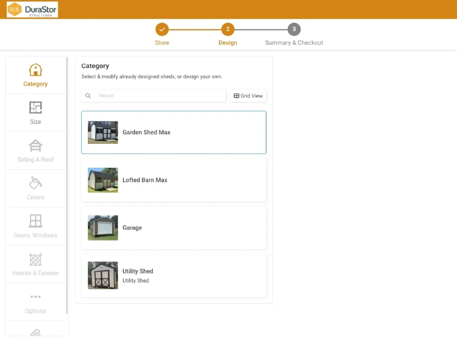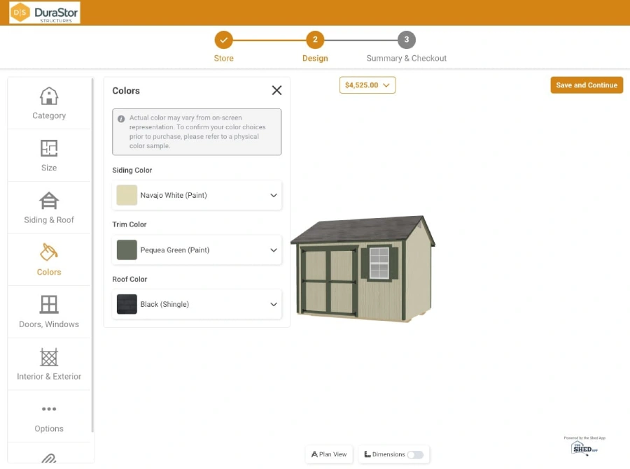 - Select the model, size and color of your shed